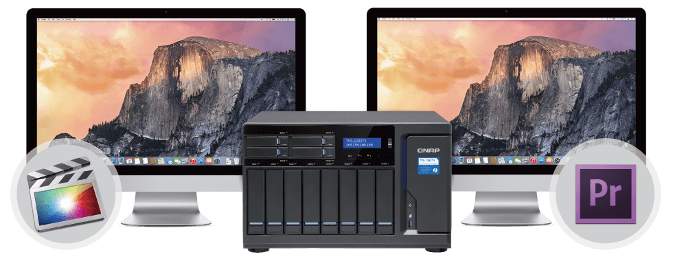 Одна рабочая станция Mac подключена к TVS-1282T3 по порту Thunderbolt 3 для редактирования видео с полосой пропускания 40 Гбит/c, другой порт используется для увеличения дискового пространства: к накопителю можно подключить до 6 полок расширения (TX-500P / TX-800P) для получения максимальной емкости в 448 Тбайт.