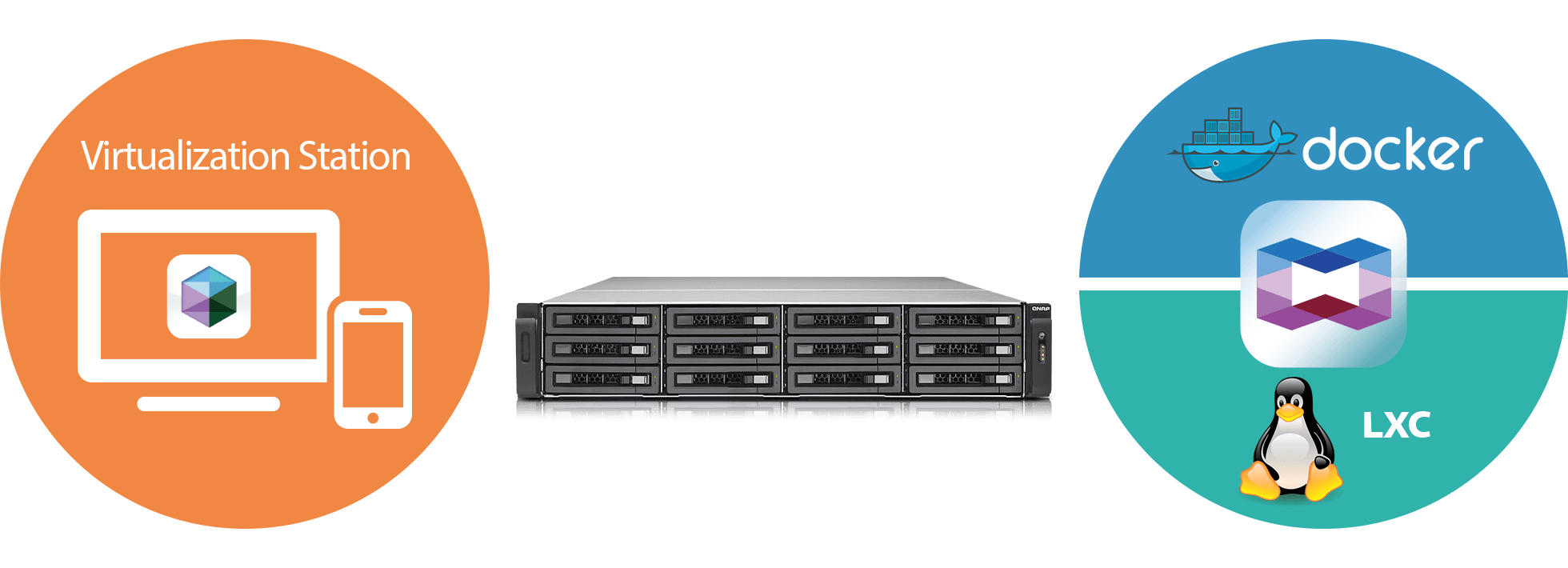 Virtualization Station предназначена для размещения виртуальных машин (ВМ) на сетевом накопителе и взаимодействия с ними через веб-браузеры или VNC. Функционал станции позволяет быстро создавать виртуальные машины, делать бэкапы, снапшоты, восстанавливать, импортировать и экспортировать, а также существует возможность централизованного управления виртуальными машинами. Сетевой накопитель и станция виртуализации способны разделять одни и те же LAN порты между собой. Высокопроизводительный виртуальный коммутатор повышает эффективность обмена, как между виртуальными машинами, так и между виртуальными машинами и накопителем через внутренний интерфейс.