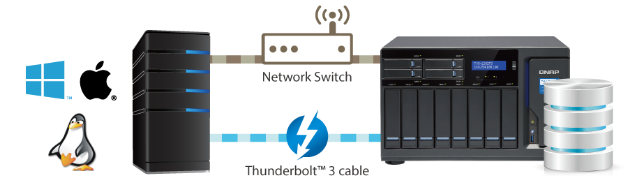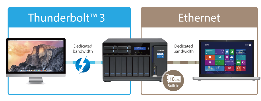 Интерфейс Thunderbolt 3 обеспечивает высокоскоростную передачу всех сетевых служб, включая протоколы общего доступа к данным, FTP и другие. Хранилище TVS-1282T3 умеет одновременно работать со службами Ethernet через встроенную карту 10 GbE и с сетью Thunderbolt 2, независимо и без взаимных помех для пропускной способности. Таким образом, можно гибко распределять пропускную способность между различными задачами, выполняющимися одновременно.