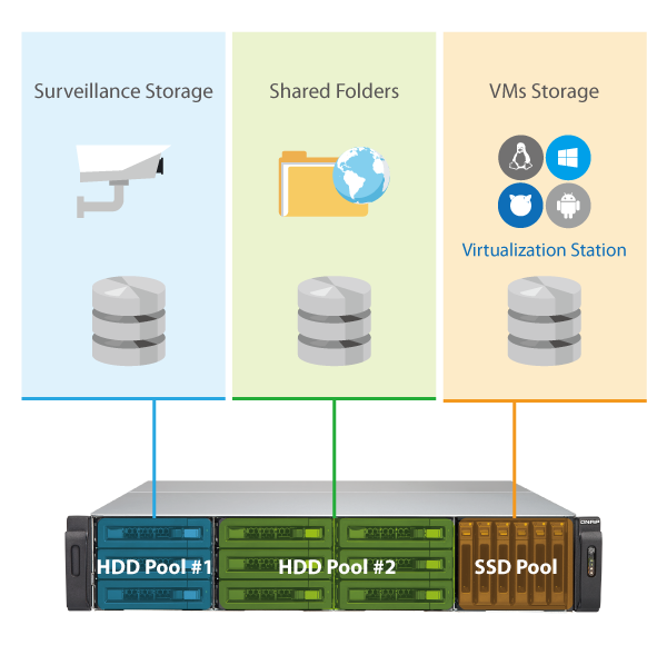 Различным приложениям нужна разная производительность, например Станция видеонаблюдения требует более высокий приоритет доступа к хранилищу для обеспечения целостности записей. При этом требуемый уровень производительности не может быть гарантирован, когда устройство занято обработкой запросов от большого количества работающих приложений. Благодаря поддержке трех разных типов накопителей – M.2, SSD и SATA HDD – в TVS-1582TU можно сконфигурировать независимые разделы для разных приложений, обеспечив необходимый уровень производительности для каждого из них.