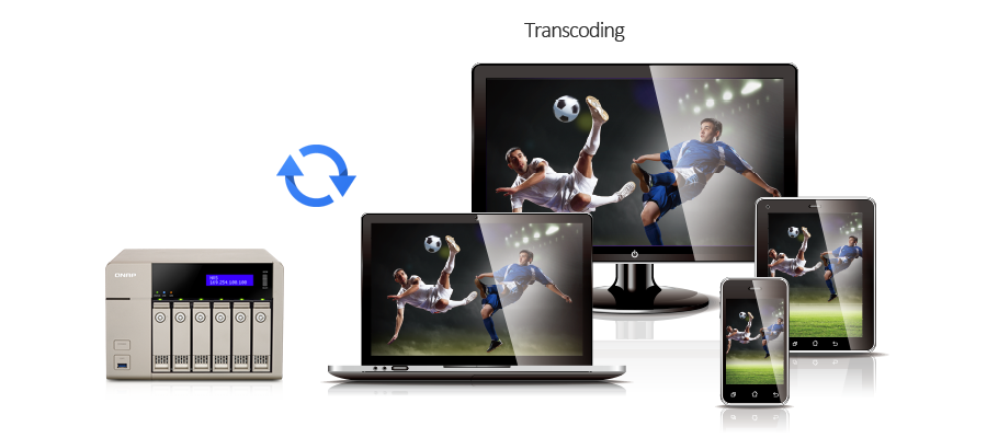 Благодаря аппаратной подсистеме транскодирования TVS-463 обеспечивает идеальное преобразование видео высокой четкости (Full HD, 1080p) в режиме реального времени, конвертируя видео из общих в универсальные форматы, которые легко воспроизводятся на персональных компьютерах, мобильных устройствах и телевизорах с поддержкой Smart TV. TVS-463 позволяет мгновенно просматривать видео на нескольких устройствах – в том числе на тех, которым не хватает вычислительной мощности, и тех, которые поддерживают ограниченный набор форматов, не прибегая к помощи сложных и отнимающих массу времени процедур конвертации.