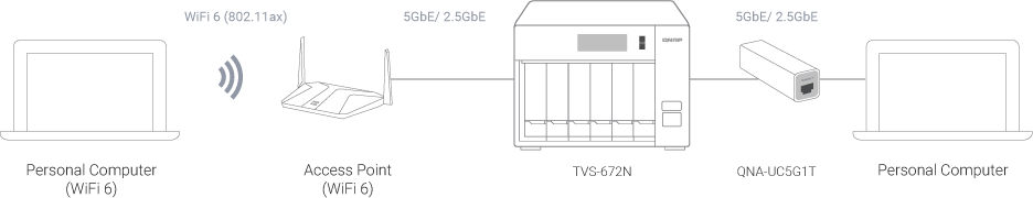 Поскольку все больше ноутбуков и точек доступа поддерживают стандарт Wi-Fi 6 (802.11ax), пропускная способность беспроводной сети увеличилась до 5/2,5 Гбит. TVS-872N позволяет обеспечить доступ к данным на скоростях более 1 Гбит/с.