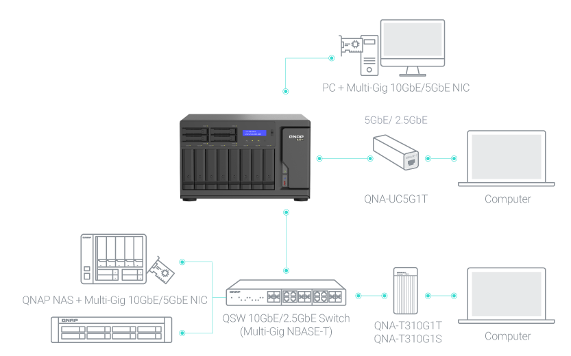 Линейка оборудования QNAP включает все необходимые компоненты для организации высокоскоростной сетевой инфраструктуры: карты с интерфейсами 2,5/5/10 Гбит/c, внешние адаптеры 5 Гбит/с, коммутаторы с портами 2,5 и 10 Гбит/c.