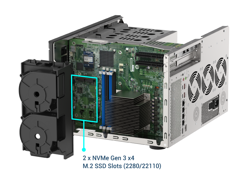 TVS-h1288X имеет четыре 2,5-дюймовых отсека для твердотельных накопителей SATA 6 Гбит/c и два слота для твердотельных накопителей M.2 NVMe Gen 3 x4. Такая архитектура помогает гибко настроить кэширование или создать скоростной массив для приложений, требовательных к производительности операций ввода-вывода. В сочетании с высокоскоростными сетевыми интерфейсами, это дает отличные результаты при работе с базами данных и приложениями виртуализации. Благодаря выделенным отсекам и слотам для твердотельных накопителей, все 3,5-дюймовые отсеки при необходимости остаются для жестких дисков большой емкости, что обеспечивает как максимальную емкость, так и высокую производительность решения на базе TVS-h1288X.