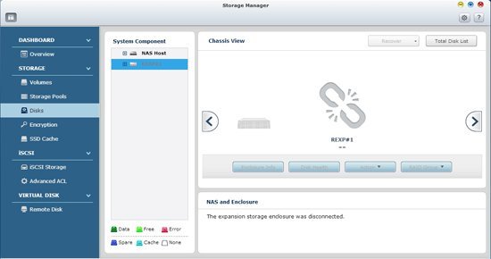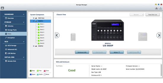 Менеджер хранения QTS предлагает все необходимые инструменты и возможности для управления системой хранения данных в виде удобного и понятного графического интерфейса пользователя, что значительно упрощает процесс расширения дисковой емкости сетевого накопителя и управления модулем UX-800P. Независимо от уровня подготовки, пользователь может легко контролировать состояние UX-800P и установленных в него дисков. В случае подключения сразу нескольких модулей расширения можно без труда идентифицировать каждый из них и соответствующие диски.